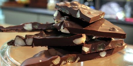 1. Melt the chocolate over a bain-marie. Stir in the nuts and ginger. Pour into a pan lined with greased waxed paper, and let harden in the refrigerator. Serve the whole stretch of pavement on a board and let guests hack away at leisure. Like your very own homemade chocolate bar!