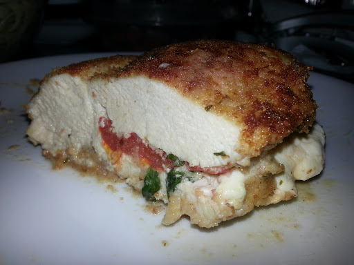 1. Preheat oven to 425. Dip outside of butterflied breasts in egg white, then in bread crumbs. On one side of butterflied chicken, place sliced mozzarella and top with bruschetta, but do not over-stuff. Fold breast in half and secure with 3-4 toothpicks on an angle. Repeat with remaining chicken.