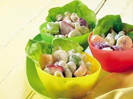 Gently stir cooled cooked pasta and dressing into salad. Gently stir in strawberries. Serve in lettuce-lined cups.