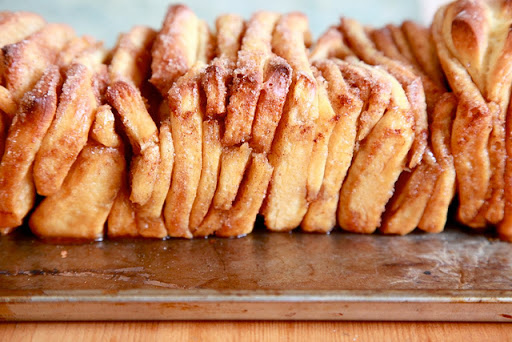 Deflate the risen dough and knead about 2 tablespoons of flour into the dough. Cover with a clean kitchen towel and let rest for 5 minutes. On a lightly floured work surface, use a rolling pin to roll the dough out. The dough should be 12-inches tall and about 20-inches long. If you can’t get the dough to 20-inches long… that’s okay. Just roll it as large as the dough will go. Use a pastry brush to spread melted butter across all of the dough. Sprinkle with all of the sugar and cinnamon mixture. It might seem like a lot of sugar. Seriously? Just go for it.