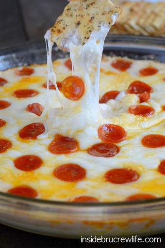 Lay out the mini pepperonis all over the top. Bake at 350 degrees for 20-25 minutes. Serve immediately with chips or crackers.