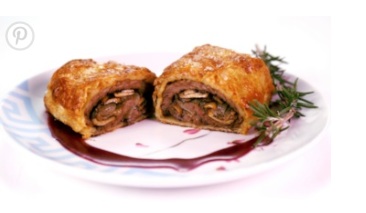 Place a seared beef cutlet vertically in front of you. Top with some onions and mushrooms. Starting with the bottom, roll the beef cutlet up like a jelly roll. Place rolled beef on top of one piece of puff pastry. Fold dough over the beef and pinch edges to fully enclose. Place the mini beef rolls on the prepared baking sheet, seam-side-down. Repeat with remaining 5 cutlets. Brush the tops with egg wash. Then, using small leaf-shaped cookie-cutters, use the remaining dough pieces to cut out leaf shapes. Place the punched out leaves on top of each beef roll. Brush with egg wash and sprinkle the entire roll with sea salt.