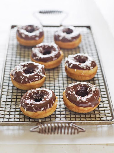 8. Dip the doughnuts in the hot chocolate, sprinkle them with toasted coconut, and serve.