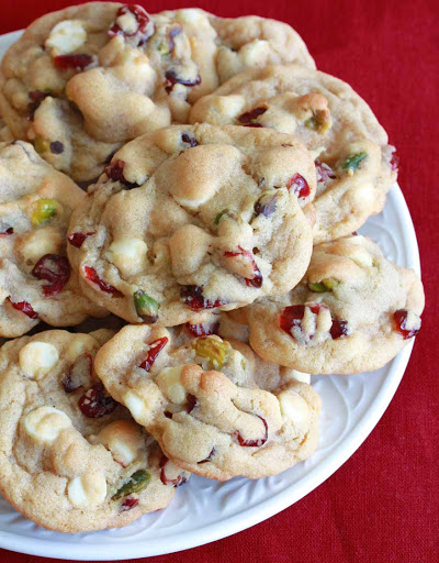 The three traditional Christmas colors wrapped into a delicious cookie! These buttery cookies feature white chocolate, sweet-tart cranberries, and slightly salty pistachio nuts.