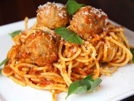 Serve the spaghetti and meatballs topped with grated Parmesan and fresh basil.