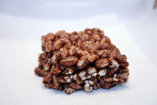 Combine butter, corn syrup, sugars and cocoa powder in a heavy saucepan. Briing to a boil. Remove from heat and add vanilla. Pour over puffed wheat. Mix well and press into a greased 9"x13" pan. Makes 24 squares.