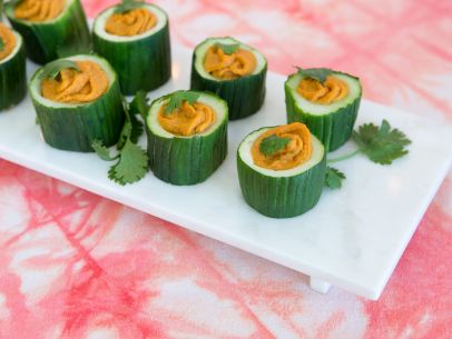 Run the tines of a fork down the length of each cucumber several times, turning to make ridges about 1/8-inch deep in the skin all the way around. Cut cucumbers crosswise into 1-inch rounds, for a total of at least 12. Using the smaller end of a melon baller or a round measuring spoon, scoop out the center of each cucumber round to form a hollow. Use a small spoon to fill each cup with hummus, mounding slightly over the top. Tuck a small fresh parsley, cilantro or mint leaf into the side of the filling as a garnish.