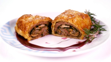 Place a seared beef cutlet vertically in front of you. Top with some onions and mushrooms. Starting with the bottom, roll the beef cutlet up like a jelly roll. Place rolled beef on top of one piece of puff pastry. Fold dough over the beef and pinch edges to fully enclose. Place the mini beef rolls on the prepared baking sheet, seam-side-down. Repeat with remaining 5 cutlets. Brush the tops with egg wash. Then, using small leaf-shaped cookie-cutters, use the remaining dough pieces to cut out leaf shapes. Place the punched out leaves on top of each beef roll. Brush with egg wash and sprinkle the entire roll with sea salt.