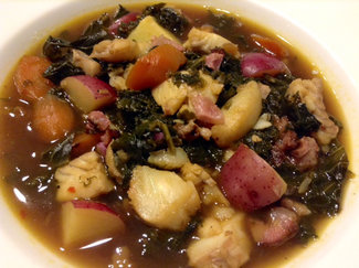 When cool enough to handle, dice the shank meat into small pieces and add back to soup along with the reserved potatoes, fish and the reserved potato water.