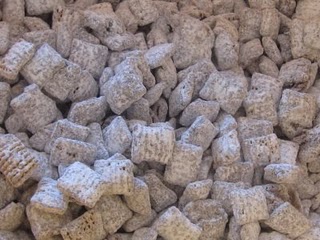Put ½ box of 10xx sugar in a tall plastic garbage bag. Add the chocolate mixture a little at a time and shake until all is coated with sugar. Add remaining sugar. Use your hands and separate the cereal from the raisins and nuts. (SOMETIMES YOU MAY HAVE TO ADD A LITTLE MORE 10XX SUGAR.)