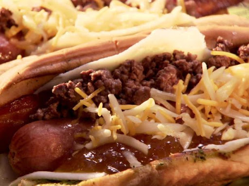 To serve, spread some peach preserves on the toasted and buttered bun. Sprinkle to taste with the chipotle pepper. Add 1 egg white to the bottom of each bun and add some of the ground beef down the center. Top with the butterflied hot dog, a slice of bacon and a sprinkling of Cheddar, gruyere and pepper jack.
