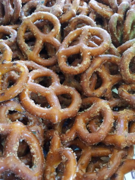 1 Put pretzels in a roaster pan. 2 (or 13x9 pan will work) Mix together the Crisco oil, dressing mix, salt and cayenne pepper. 3 Pour over pretzels. 4 Toss thoroughly! 5 Bake at 200* for 1 1/2- 2 hours. 6 Stir about every 20 minutes.