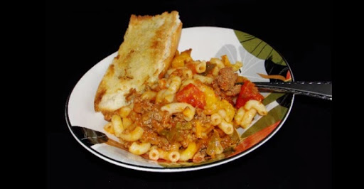 Boil macaroni, rinse and set aside until sauce has simmered. Pour macaroni into 9x13 pan and added hamburger sauce and stir. Add the cheese and gently fold into mixture, reserve some cheese to sprinkle on top. Cover pan with foil.