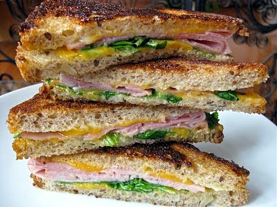 Make the aioli by adding one small, minced clove of garlic, 1/4 teaspoon dijon mustard,1/4 cup mayonnaise Slather the bread with the aioli, slice the cheese thinly and place on both slices of bread, add one slice of ham, and the greens. Grill in a buttered pan over medium heat until you’ve got a golden crust, and the cheese is melted through.