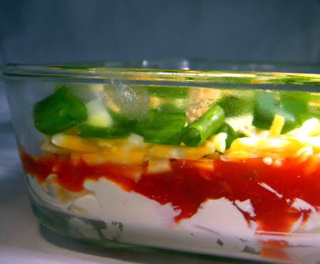 In a bowl, combine, onion, red/green peppers, tomatoe and taco sauce. Stir until well combined. Pour over cream cheese mixture. Sprinkle with grated cheddar and mozzerella chees. Refrigerate overnight.