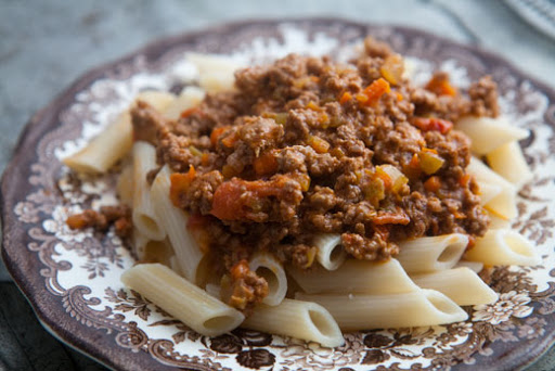 3 Stir in the wine (if using), scraping up any browned bits from the bottom of the pan. Let this boil down by half. Stir in the tomatoes. Slowly stir in the milk. Increase the heat to bring the mixture to a simmer, then lower the heat to maintain a low simmer. Simmer uncovered about 20 minutes. Add a little water if the sauce ever begins to dry out. Add salt and pepper to taste.