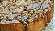 2. Pour one-third of the butter-brown sugar mixture into a greased 10-inch cake pan, then sprinkle in half of the chopped walnuts in an even layer. Keep the remaining butter-sugar mixture in a warm place so it stays pourable.