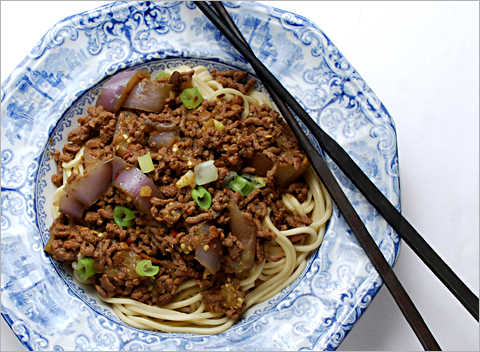 Uncover the pan with meat sauce in it, then raise the heat and cook it until the liquid is cooked down and there is only a small amount of liquid in the bottom of the pan. There should be only enough liquid to coat the bottom of the pan in a very thin layer. At this point, stir in most of the scallions, reserving about a teaspoon for garnish, and stir in the sesame oil. If the noodles are not cooked yet, turn off the heat and cover the pan.