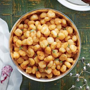 3. Fry hominy, in batches, 6 minutes or until kernels float to the top; remove and drain. Sprinkle hot hominy with desired amount of either spice mix.