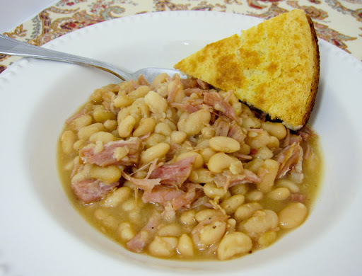 I always look forward to finishing off the ham with a nice big bowl of white beans and slice of cornbread. This recipe is super simple. It uses a pound of dried beans and simmers all day in the crockpot with a big ham bone. The Honey Baked Ham store sells ham bones year round (found that out on twitter). If you don't have ham bone, use some ham shanks, ham hocks or just some chopped up ham. I love the creaminess of white beans combined with the saltiness of the ham. This is comfort food at its best!