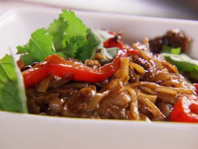 Into the hot skillet, add the remaining tablespoon of oil. Add the meat mixture, evenly distributing it over the surface of the skillet. Allow to sit for 45 seconds, then turn with tongs. Cook for another 30 seconds, then add the onions and peppers back into the skillet. Reduce the heat to low. Pour in the remaining marinade and stir. Allow to simmer on low for a few minutes; the sauce will slowly thicken. Turn off the heat.