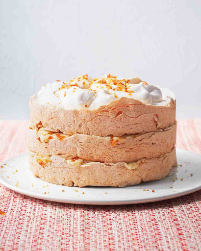 Meringue: Preheat oven to 275 degrees. Butter three 8-inch round cake pans. Line bottoms and sides with parchment, leaving at least 1/2 inch extra on sides; butter parchment. Pulse sugar, cornstarch, and salt in a food processor until finely ground.