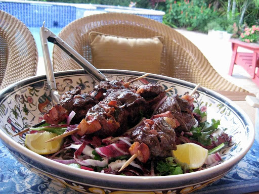 Grill, turning once, until cooked medium rare, about 3 minutes per side. Toss escarole and onions with oil and lemon juice in a 3:1 ratio and season. Place salad on a platter and place the skewers on top. Serve with lemons on the side.