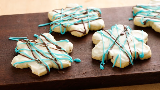 On work surface sprinkled lightly with flour, roll dough 1/4 inch thick. Cut with floured 2 1/2- to 3-inch snowflake-shaped cookie cutters; place 1 inch apart on ungreased cookie sheets. Repeat with remaining dough, rerolling scraps.