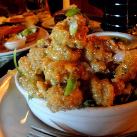 When all of the shrimp are fried add set the greens on a platter, top with the shrimp and drizzle with the sauce or serve it on the side for dipping. Garnish with green onions.