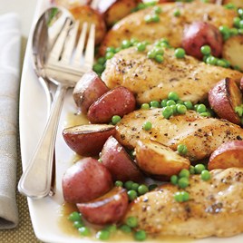 3. Increase heat to medium-high and cook, uncovered, until sauce is reduced to 1 cup, about 5 minutes. Stir in peas and cook until heated through, about 1 minute. Off heat, whisk in butter and lemon juice and season with salt and pepper. Pour sauce over chicken and potatoes. Serve