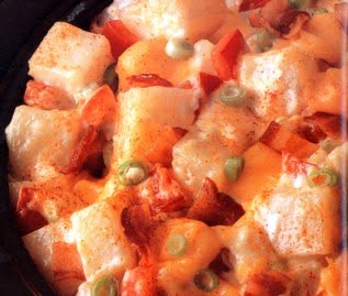 In large saucepan, combine potatoes, 1/4 lb. process cheese spread and margarine; stir over low heat until process cheese spread is melted. Add 2 tablespoons bacon, 2 tablespoons onions, salad dressing, sour cream, pimento and pepper; mix well. Spoon into l 1/2-quart casserole. Top with remaining process cheese spread, bacon and onions. Sprinkle with paprika. Bake at 350°, 20 to 25 minutes or until thoroughly heated.