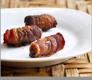 Wrap a piece of bacon around a date. Make sure the bacon seam is placed facing downward on the cookie sheet. Press firmly on the bacon-wrapped date, so it is less likely to unravel. Repeat until all of the dates are wrapped in bacon.