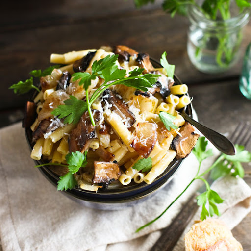Ziti with Portobello Mushrooms, Caramelized Onions, and Goat Cheese