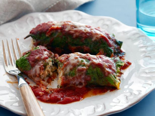 Spoon 1/3 cup of the filling onto the end of each chard leaf and roll up like a jellyroll.