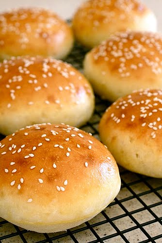 Set a large metal pan of water on the lowest rack of the oven. Preheat the oven to 400˚ F with a rack in the center. Brush the tops of the buns lightly with the egg wash and sprinkle with sesame seeds. Bake the buns about 15 minutes rotating halfway through baking, until the tops are golden brown. Transfer to a rack to cool completely.