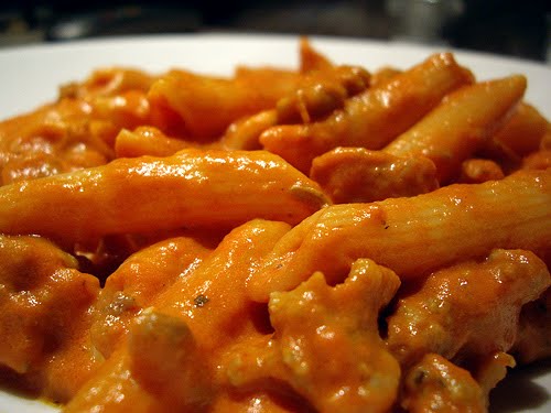Heat oil in saucepan over medium heat. Stir in bacon, onion and garlic and cook until lightly browned. Stir in cream, tomato paste, salt, pepper and vodka. Simmer 10 minutes.