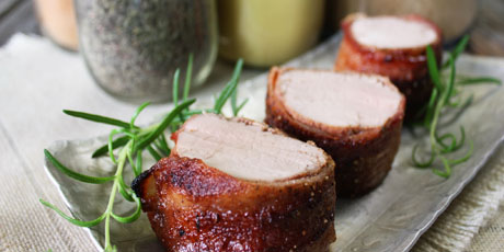 Carefully slice off and remove the ‘silverskin’ (white coating) from the tenderloin, leaving any visible fat in place. In a small bowl whisk together the brown sugar, mustard and your preferred herb or spice. Using your hands, dip the tenderloin and coat well. Season it with pepper, then fold under the small end of the tenderloin so it doesn’t overcook. Wrap the bacon all around, as tight as you can, with a slight overlap trying to have your starts and finishes on the underside. Secure the bacon by piercing through with a piece of dry spaghetti noodle and place on the prepared baking tray. Grind some more pepper over and bake to an internal temperature of 145ºF, about 20 minutes. Slice, serve and share!