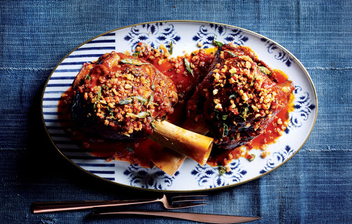 Spoon some braising liquid over veal shanks and top with breadcrumbs. Serve remaining braising liquid alongside for pouring over.