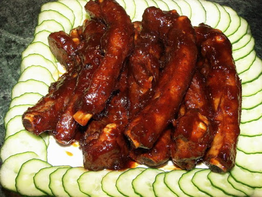 Spead ribs meaty side up in single layer in a large shallow pan. Brown ribs in 425 degree oven for 20 to 30 minutes. Drain off fat. Combine all remaining ingredients except salt and pepper, in a saucepan; stir smooth. Cook over medium heat until thick and glossy, stirring constantly.Sprinkle salt and pepper over browned ribs. Reduce oven to 350 degrees. Spoon sweet-sour sauce over each rib using about half the sauce. Bake 45 minutes. Turn ribs; cover with remaining sauce and bake 30 minutes or until done.