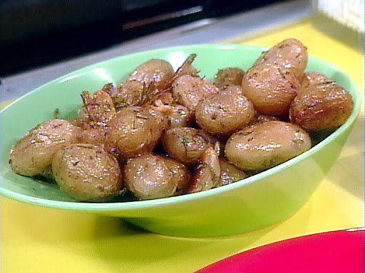 Halve potatoes and place on a cookie sheet. Combine with cracked cloves of garlic. Coat potatoes and garlic with extra-virgin oil and season with rosemary, salt and pepper. Place potatoes on center rack of oven and roast 20 minutes, until just tender.