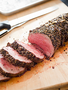 Rubbing the raw tenderloin with an abrasive mixture of kosher salt, sugar, and baking soda transformed the surface into a magnet for the pepper crust. Cracking the pepper into rough pieces and sifting off any powdery grounds created the crunchiest crust and ideal textural contrast for the juicy tenderloin. In order to tame the heat of so much pepper, we simmered the cracked pieces in oil and strained them before use, replacing some of the complex flavors with orange zest and nutmeg. For a final touch, we serve the pepper-crusted tenderloin with a tangy fruit juice–based sauce.