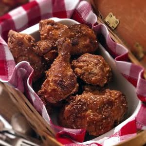 Whether you take it along on a picnic or serve it at home for a family supper, this updated "fried" chicken is a crowd pleaser. Marinating the chicken in buttermilk keeps it juicy, and the light coating of flour, sesame seeds and spices, misted with olive oil, forms an appealing crust during baking.