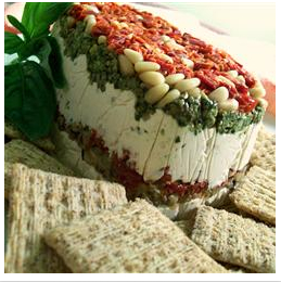 Oil a medium bowl, or gelatin mold, and line with plastic wrap for easy removal. Layer the dip into the mold as follows: Sun-dried tomatoes, pine nuts, pesto, cheese mixture. Repeat. Pat down into the mold, and refrigerate for at least one hour.