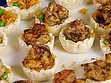 Take shrimp out of marinade and cook on grill for about 1 to 1 1/2 minutes or until done. Fill phyllo shells with rice mixture, top with grilled shrimp. Garnish with chives.
