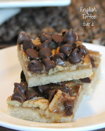 Bake in a preheated 350 degree oven for 20-22 minutes, until edges are starting to bubble. Remove from oven and sprinkle chocolate chips over top of hot bars. Gently tap pan on counter to secure chocolate chips into place.