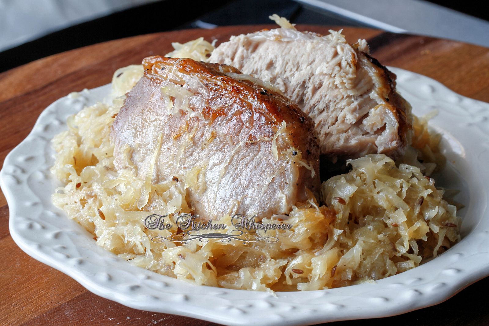 I cooked in crockpot. Drained juice from sauerkraut into crockpot. Add apple and onion, caraway seeds plus a little water although I think it would have been fine with just the sauerkraut “juice”. Mix salt, pepper, light brown sugar and smoked paprika. Rub on tenderloin and brown in olive oil, add pork to crockpot. Cook pork about three hours on low. Stir sauerkraut in bottom mixture and continue to cook for 1-1 1/2 hours until sauerkraut is cooked and pork shreds. Serve with mashed potatoes. Delicious!!!! ?
