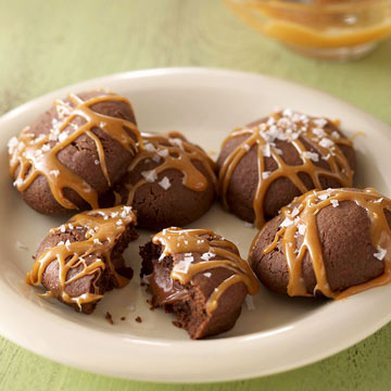 3. Preheat oven to 375 degrees F. Shape dough into 1 1/2-inch balls. Press a chocolate-covered caramel into each ball and shape dough around caramel to enclose. Place cookies 2 inches apart on an ungreased cookie sheet.