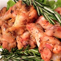 2. In a large bowl, toss wings with rosemary, garlic, oil, lemon pepper, and salt until coated. Line 2 large baking sheets with aluminum foil, and arrange wings on sheets in 1 layer. Bake 20 minutes, turn over, and bake another 15 minutes, or until juices run clear. Remove from oven.