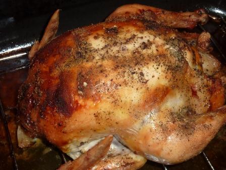 Clean and dry chicken. Place it in a roasting pan. Place the onion and lemon in the cavity. Place the butter between the skin and breast meat. Cover with seasonings. Bake at 275 F for ~3 hours or until the internal temperature is 190F.