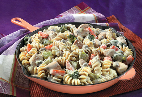 Chicken, vegetables and pasta simmer together in a creamy mushroom sauce, touched with basil, for a carefree skillet supper.